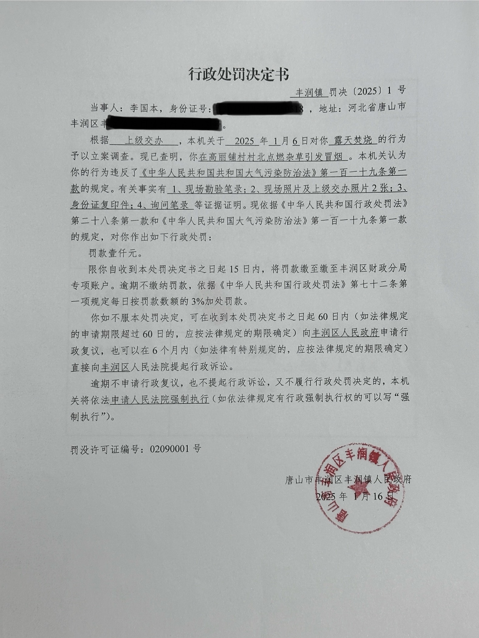 行政处罚决定书丰润镇罚决【2025】1号