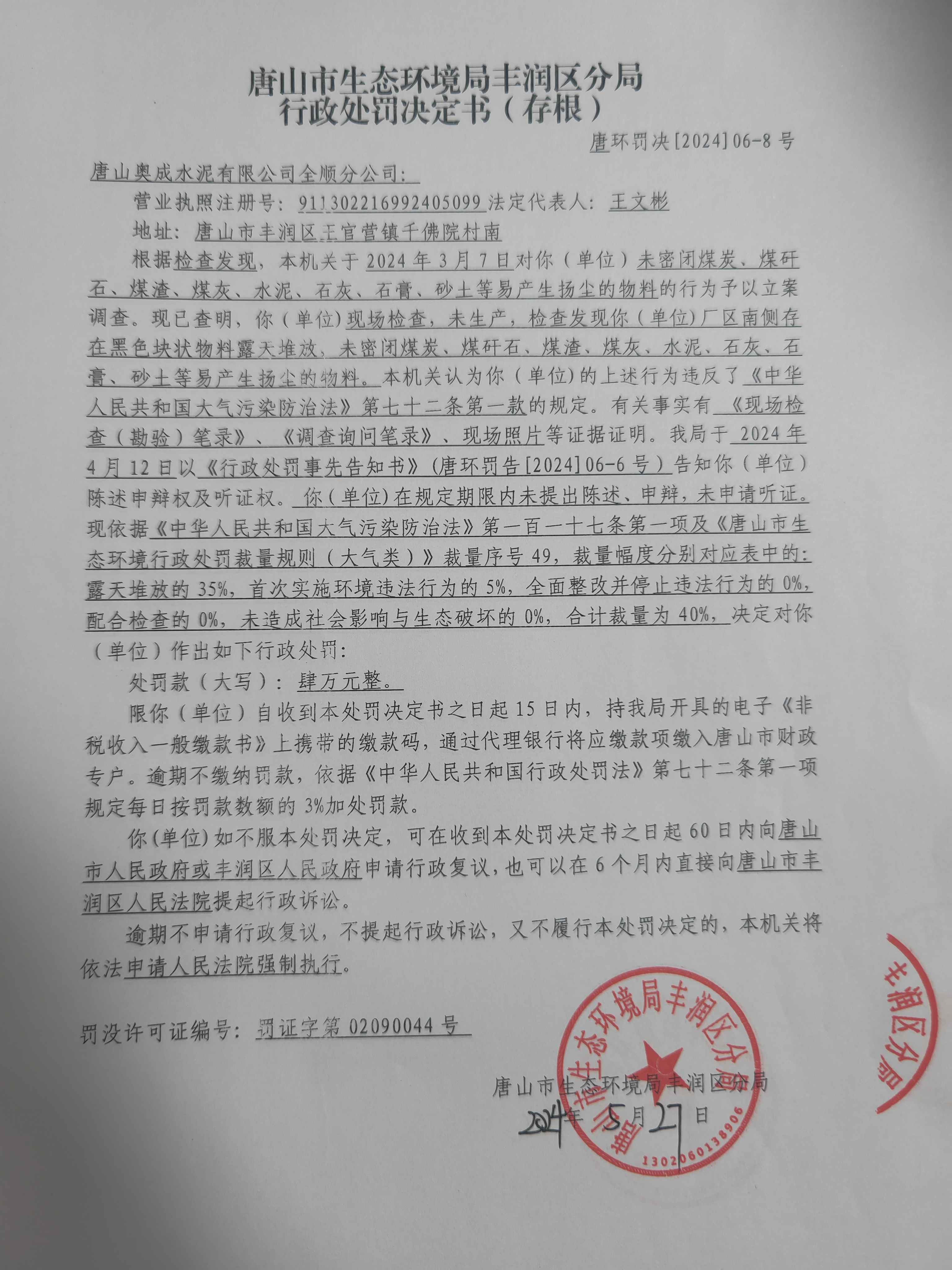 唐山市生态环境局丰润区分局对唐山奥成水泥有限公司全顺分公司的行政处罚