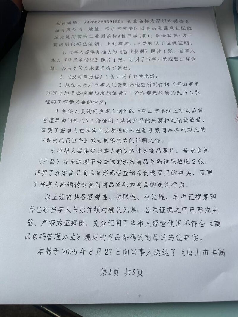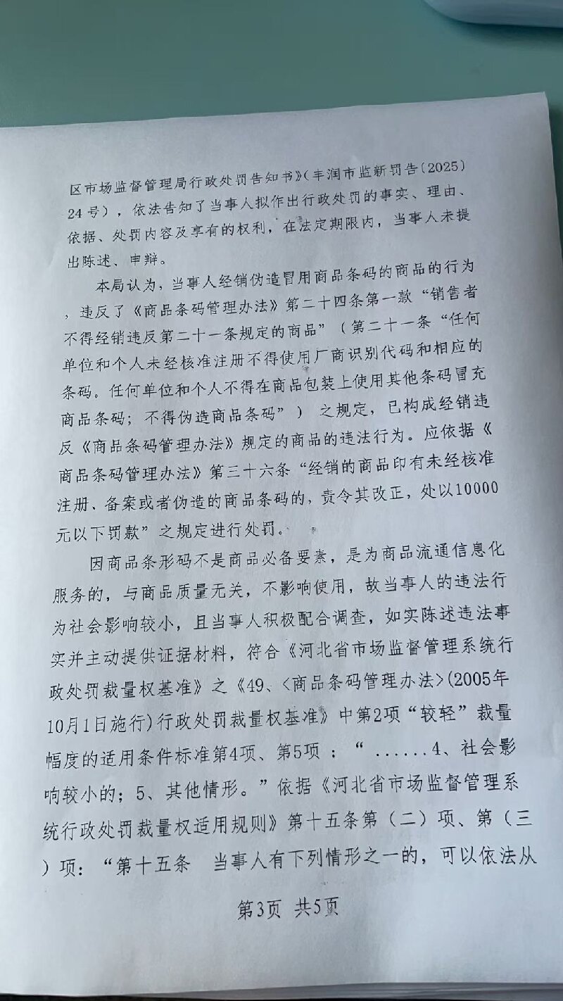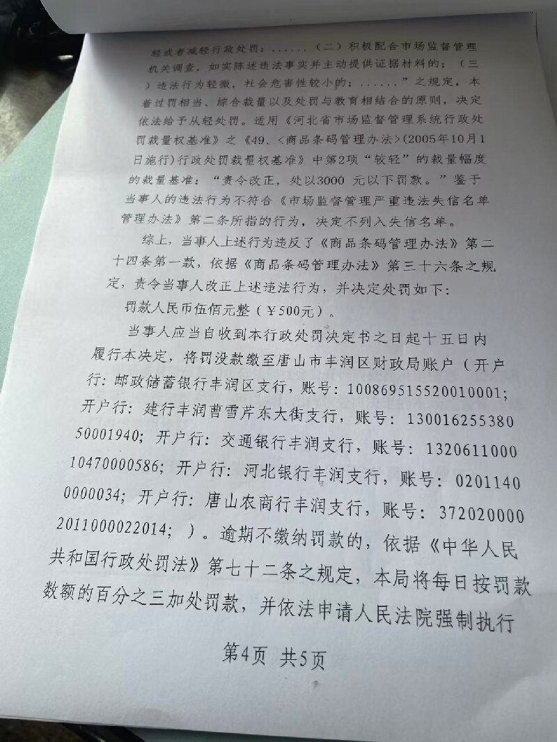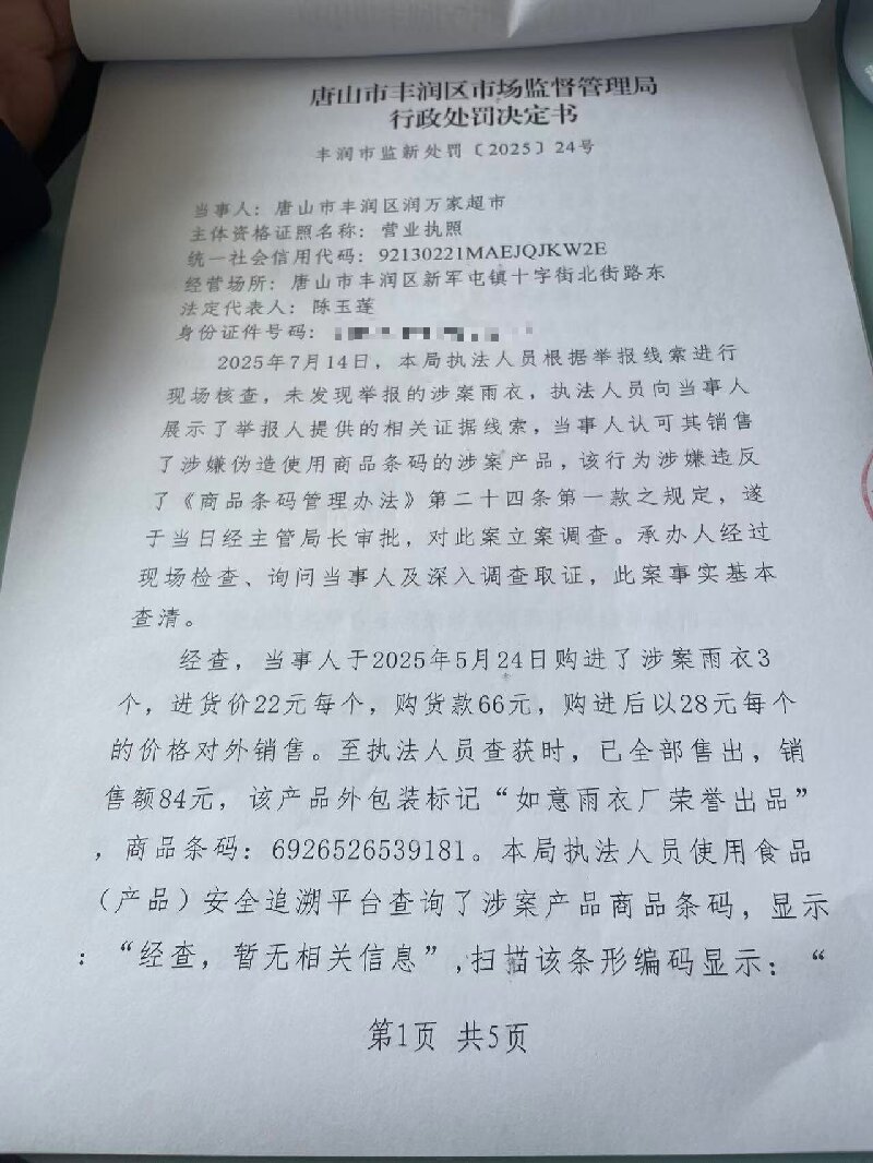 唐山市丰润区润万家超市经销《商品条码管理办法》规定的商品