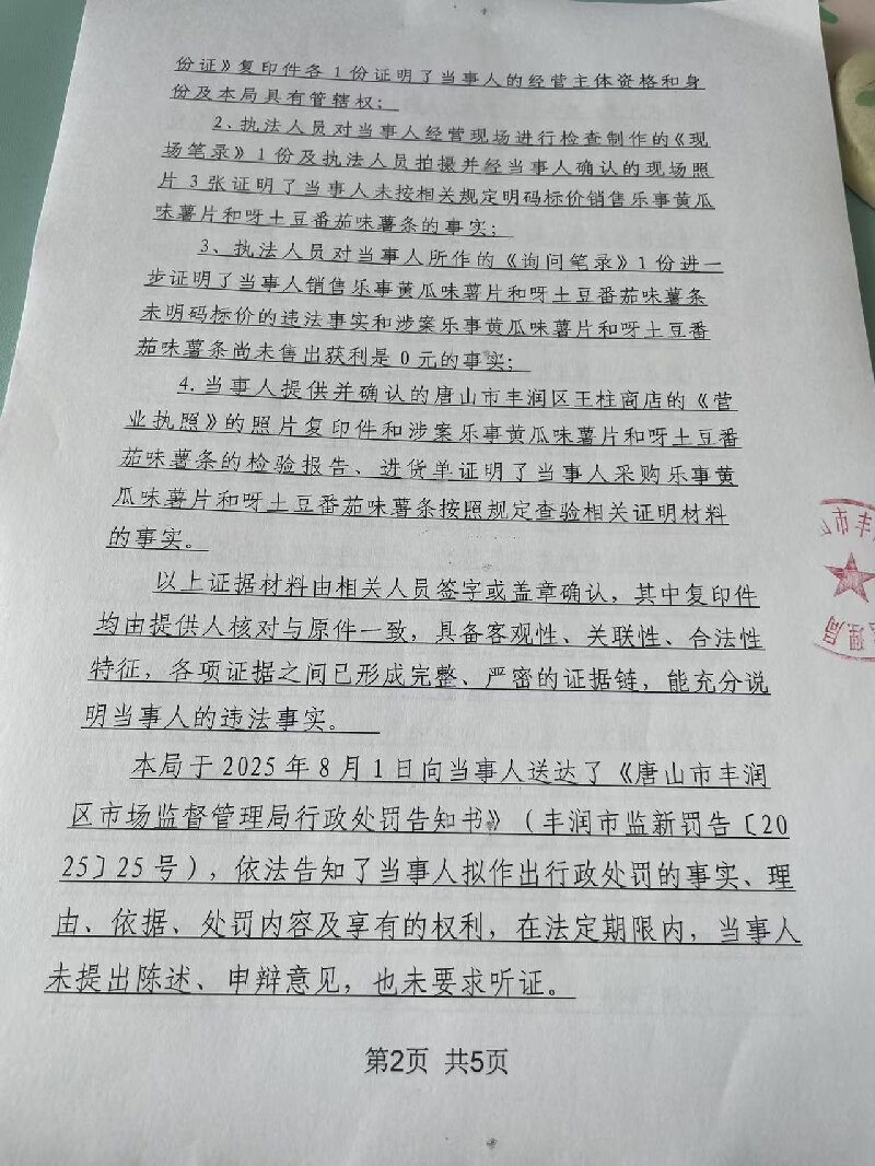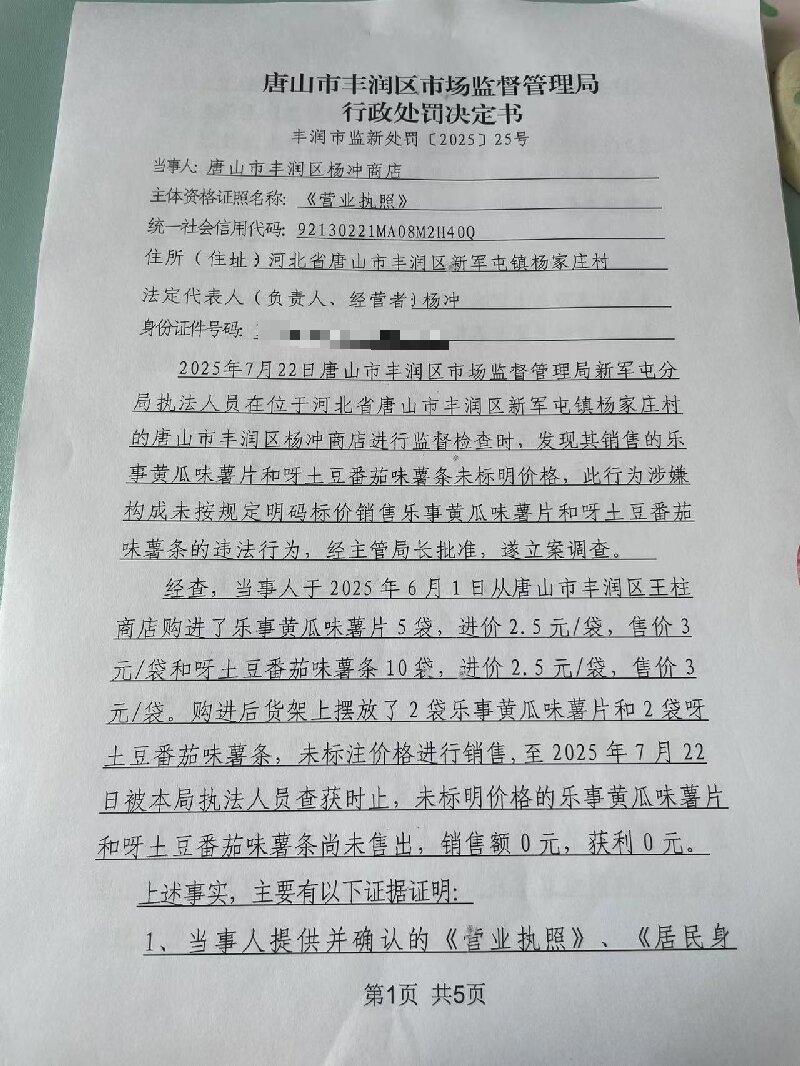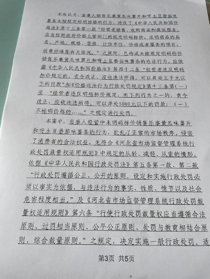 未按规定明码标价销售乐事黄瓜味薯片和呀土豆番茄味薯条案