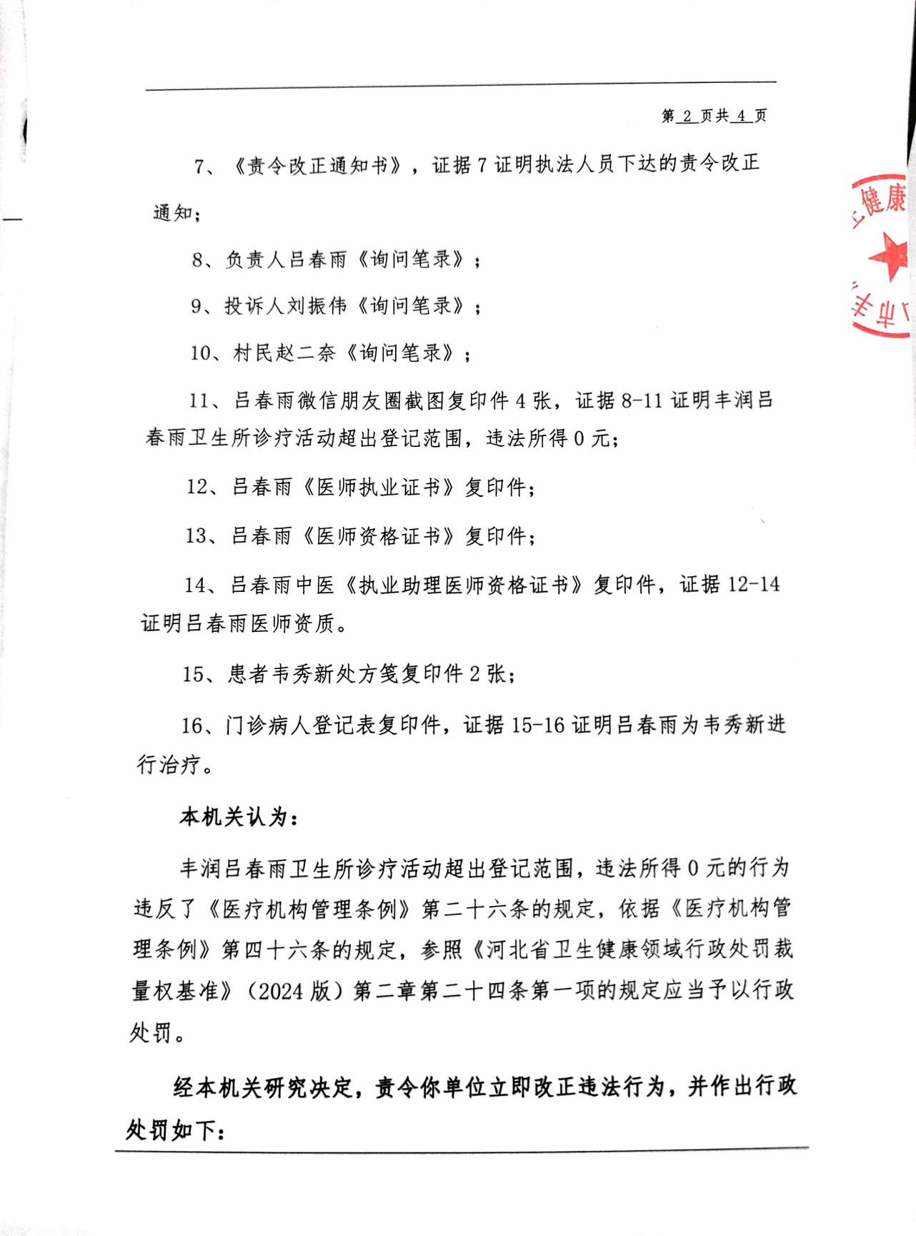 唐山市丰润区吕春雨卫生所诊疗活动超出登记范围案