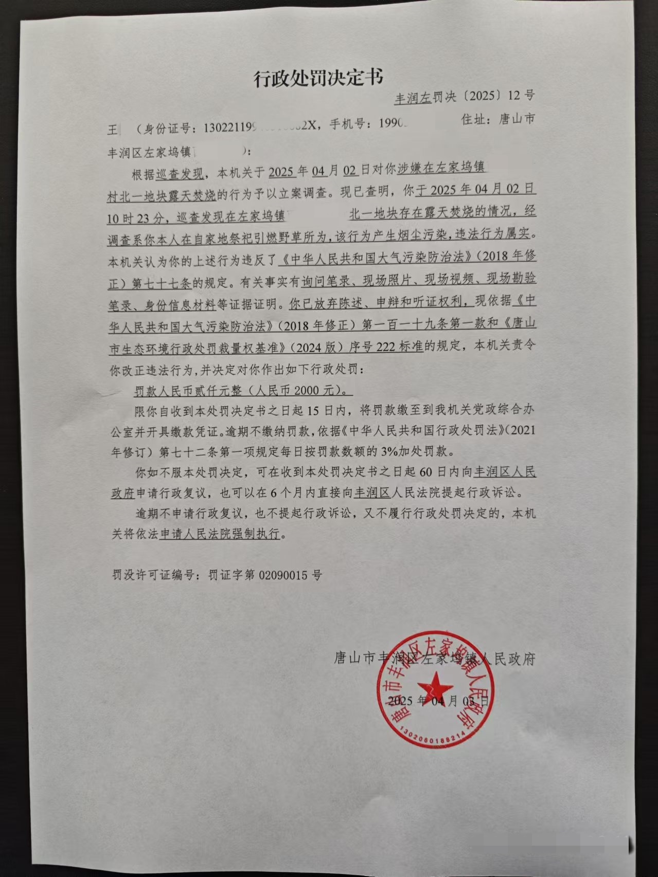 左家坞镇行政处罚公示 丰润左罚决[2025]12号